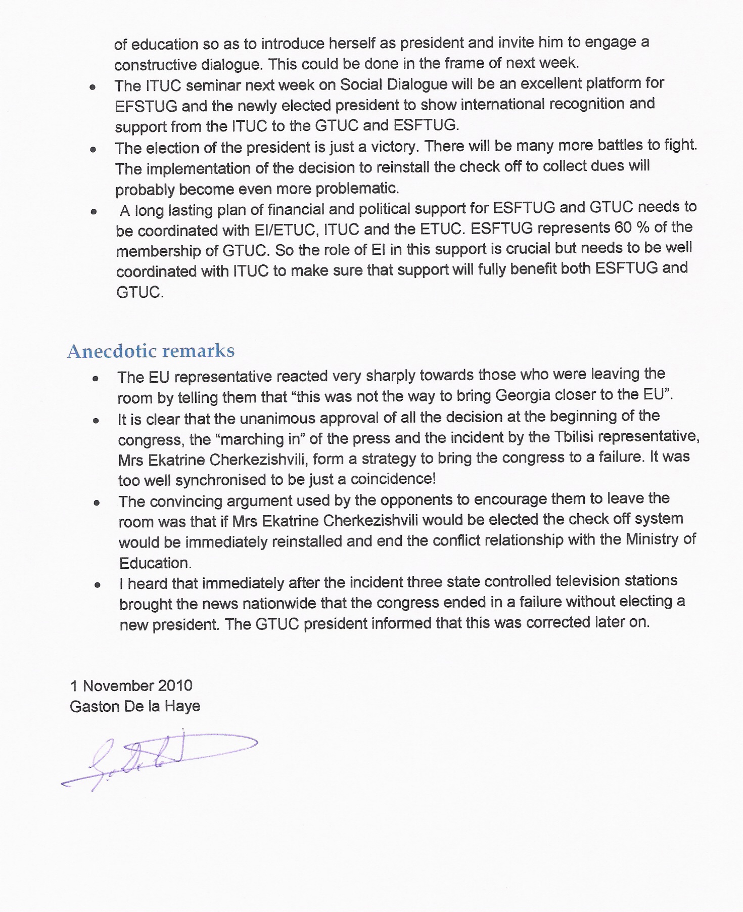 აეროპორტში, 30 ოქტომბერს დილის 4 საათზე გასტონ დე ლა ჰეს სპმთპ-ის საერთაშორისო მდივანი მარი ალუღიშვილი შეხვდა. მან სასტუმრომდე მოკლედ გამაცნო უკანასკნელი მოვლენები.