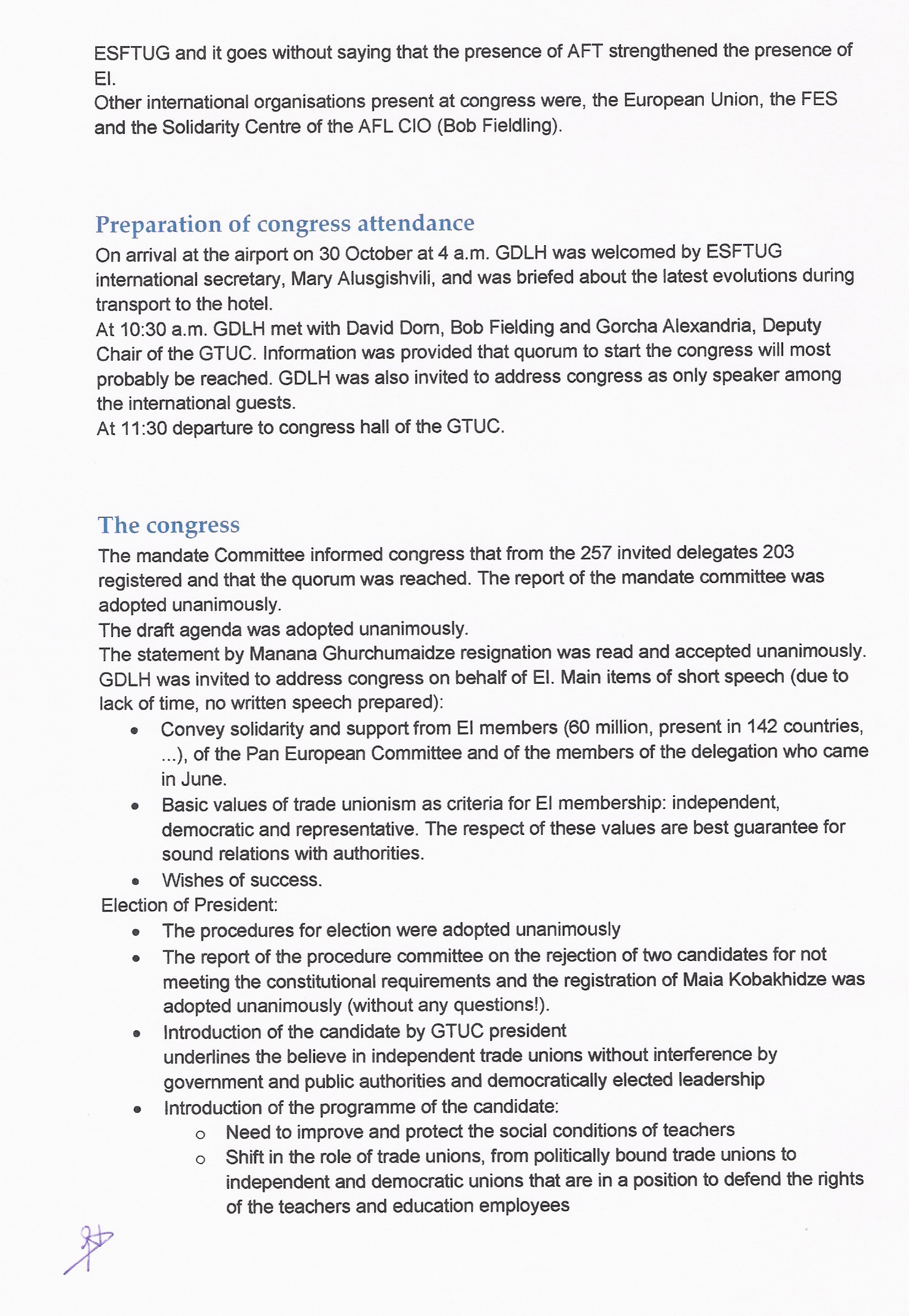 კამერებთან ინტერვიუს დროს მე ავღნიშე რომ განათლების ინტერნაციონალი არჩევნების კანონიერებას აღიარებს, რადგანაც პრეზიდნტი არჩეული იყო 111 ხმათ დარეგისტრირებული 203 დელეგატიდან. გამოვაცხადე მთლიანი მხარდაჭერა ინტერნაციონალის მხრიდან ახლად არჩეული პრეზიდნეტისა და სპმთპ-სადმი.