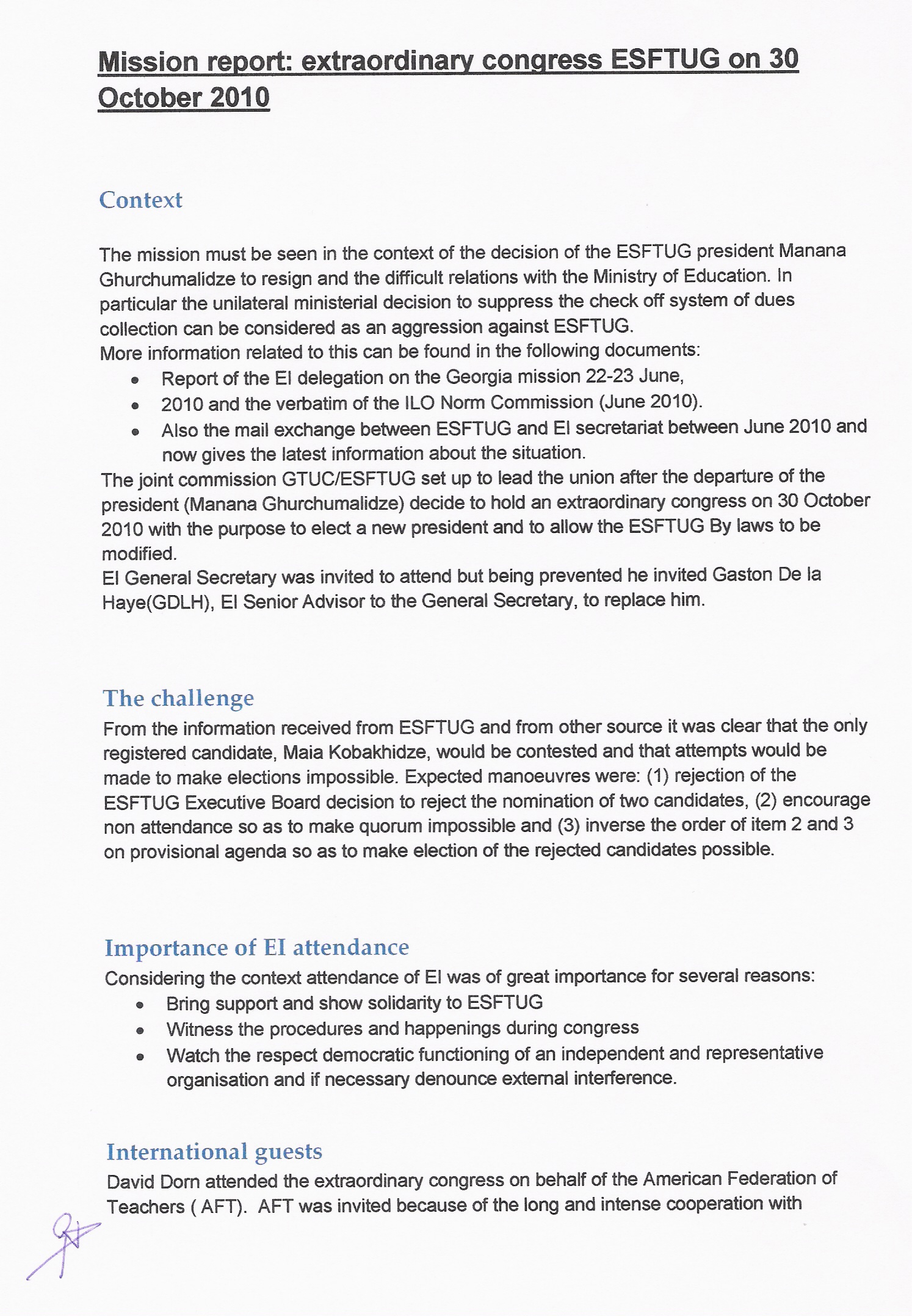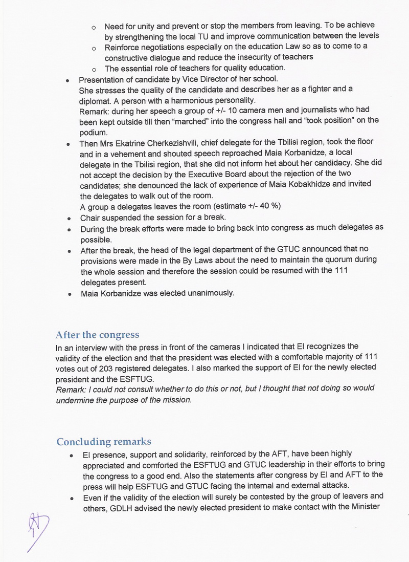 დამატებითი დეტალური ფაქტები აღნიშნულ საკითხთან დაჯავშირებით მოცემულია განათლების ინტერნაციონალის 22 -23 ივნისის (2010 წელი) ვიზიტის ანგარიშში, 2010 წლის შრომის საერთაშორისო ორგანიზაციის დოკუმენტებსა და სხვადასხვა კორესპოენდენციებში 2010 წლის ივნისიდან ამ დრომდე რაც აღწერს არსებულ სიტუაციას.