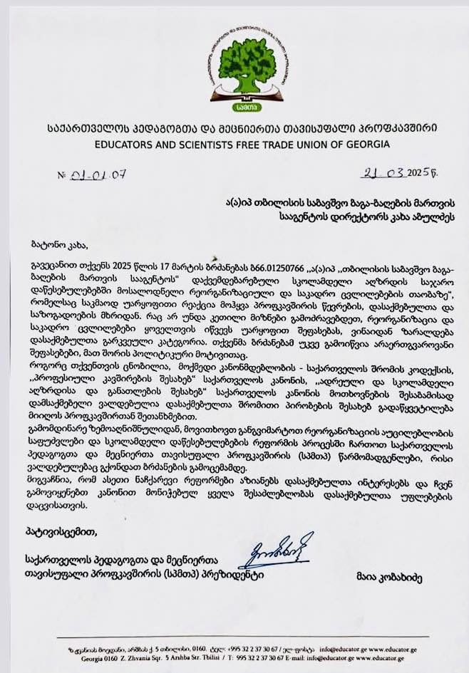 We have reviewed your order B66.01250766, issued on March 17, 2025, regarding the expected reorganization and personnel changes in public preschool institutions under the supervision of the Tbilisi Kindergarten Management Agency. This decision has been met with strong opposition from trade union members, employees, and the public. Regardless of your intentions, reorganization and personnel changes inevitably lead to negative perceptions, as they directly affect certain employees. Your order has already sparked mixed reactions, including politically motivated interpretations.